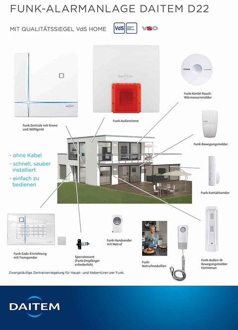 Fällt ein Funk-Frequenzband aus, sichert ein zweites die Übertragung. Analog dazu garantieren zwei unabhängige Batterie-Packs die sichere Stromversorgung. Auch gesundheitlich ist die D22 unbedenklich: Ein Handy hat eine 200-mal höhere Sendeleistung. Zudem entspricht die D22 sowohl VdS Home als auch den Sicherheitsanforderungen nach DIN EN 50131 Grad 2 und wird durch die KfW gefördert.